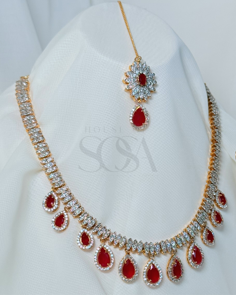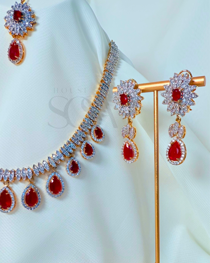 Radiant and timeless, the Nooré Set is thoughtfully curated as part of the Aurelia Collection, bringing together elegance, balance, and refined detail. Featuring rich ruby-toned stones framed by delicate brilliance, this set is selected for its graceful silhouette and luminous presence.